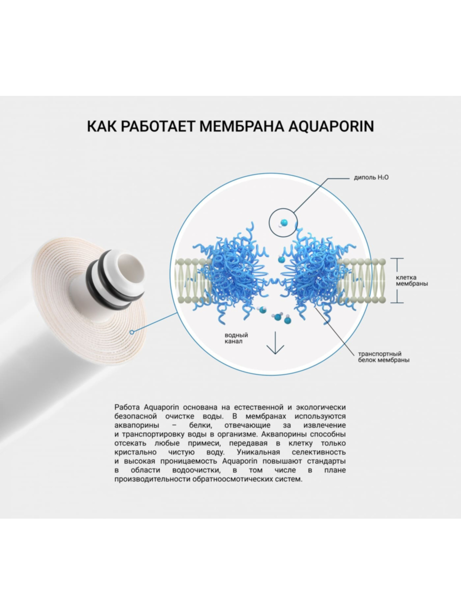 - Патентованная технология Aquaporin Inside: мембранные белки аквапорины воспроизводят принципы живой клетки, обеспечивая эффективную передачу молекул воды и отталкивание загрязнений;