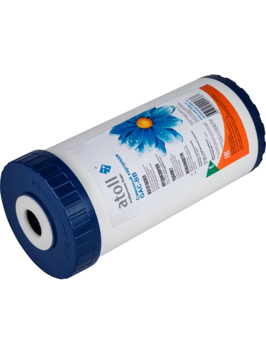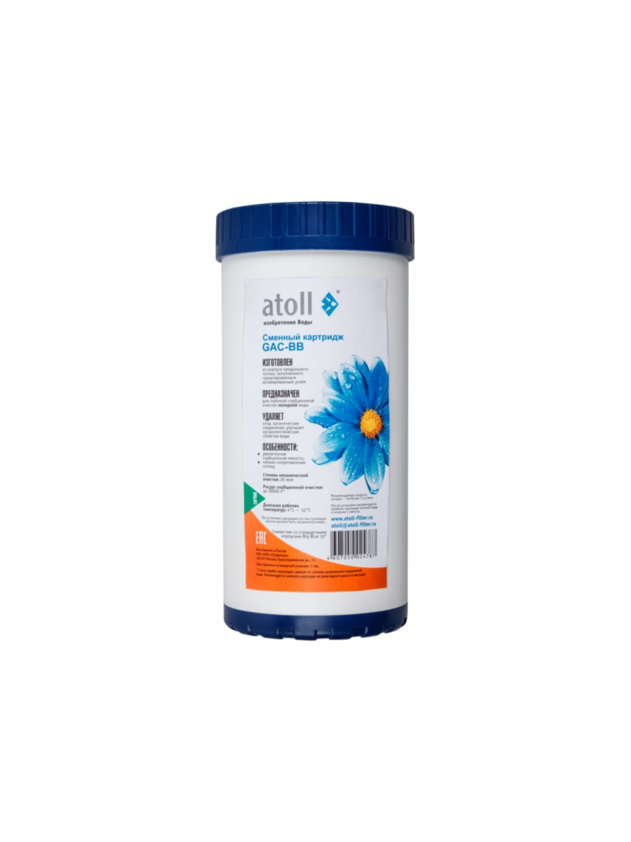 Картридж atoll GAC-BB предназначен для фильтрации холодной воды и изготовлен из гранулированного активированного угля, находящегося в прочном пластиковом корпусе. Обладает выраженными адсорбционными свойствами, эффективно удаляя из воды посторонние запахи и привкусы, а также органические примеси. Подходит для использования в фильтрах с корпусами стандартного размера BB10, обеспечивая улучшенные органолептические свойства воды и защиту последующих ступеней фильтрации от преждевременного износа. Ресурс картриджа зависит от качества исходной воды и интенсивности использования, однако регулярная замена позволяет постоянно получать чистую и свежую воду.