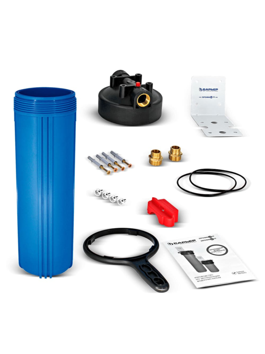 Корпус магистрального фильтра Барьер Профи BB20 G1 выполнен из непрозрачного пластика и предназначен для установки сменных картриджей стандарта Big Blue 20.