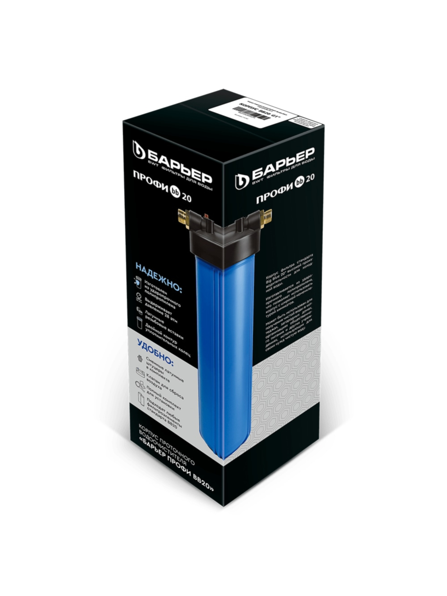 Корпус магистрального фильтра Барьер Профи BB20 G3/4 выполнен из непрозрачного пластика и предназначен для использования в системах фильтрации холодной воды.