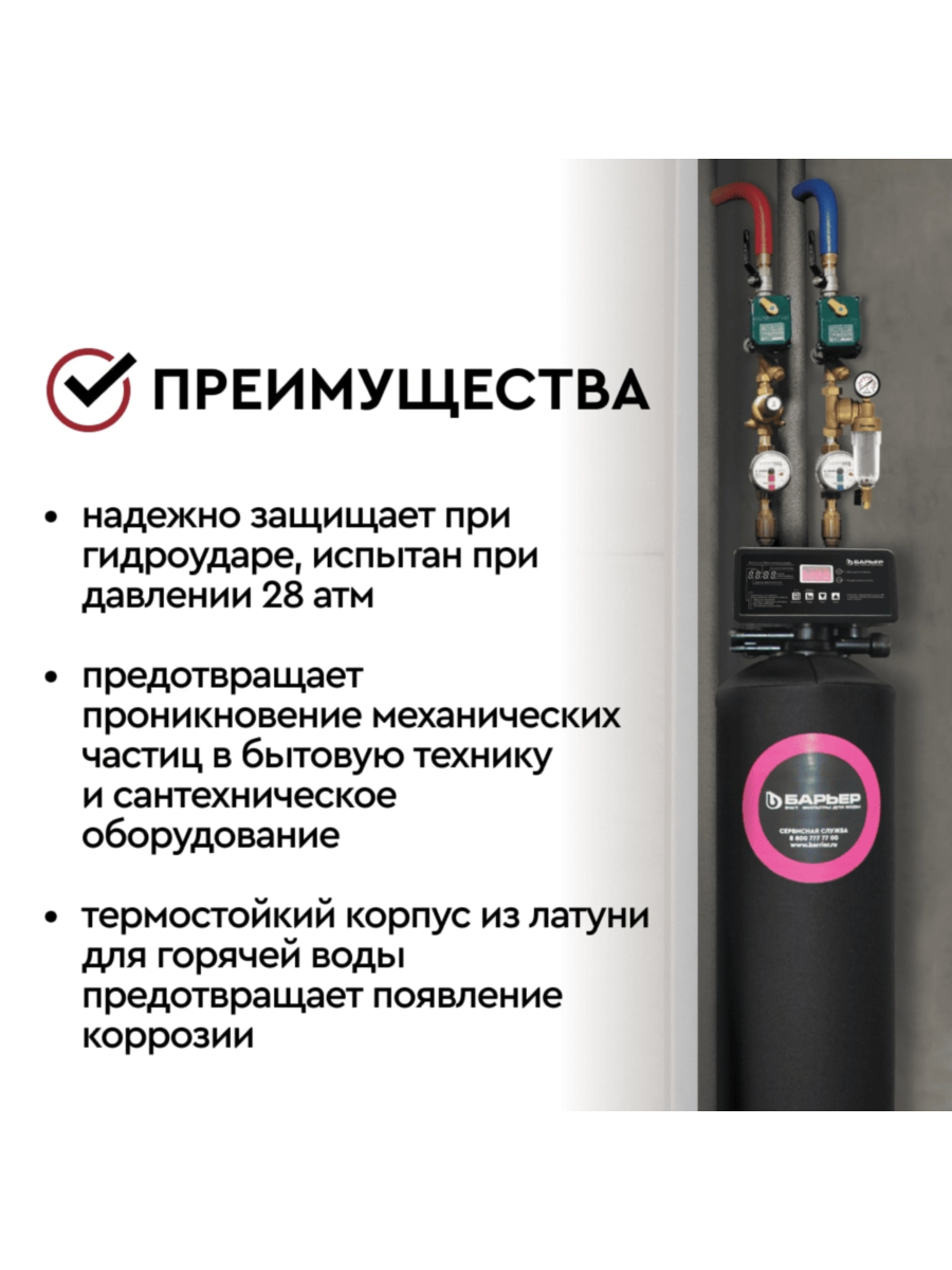 Магистральный фильтр Барьер Протект универсальный 3/4 ГВС предназначен для качественной очистки горячей и холодной воды от крупных нерастворимых частиц размером более 100 микрон, а также нормализации давления в системе водоснабжения.