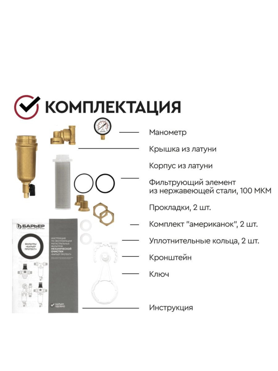 Полная информация о технических характеристиках и особенностях эксплуатации фильтра Барьер Протект универсальный 3/4 ГВС представлена в прилагаемой инструкции.