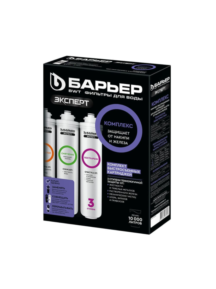 - Барьер Эксперт ПостКарбон — обеспечивает завершающую стадию очистки, улучшая вкус и запах воды, а также удаляя остаточные примеси, такие как хлор и органические соединения.