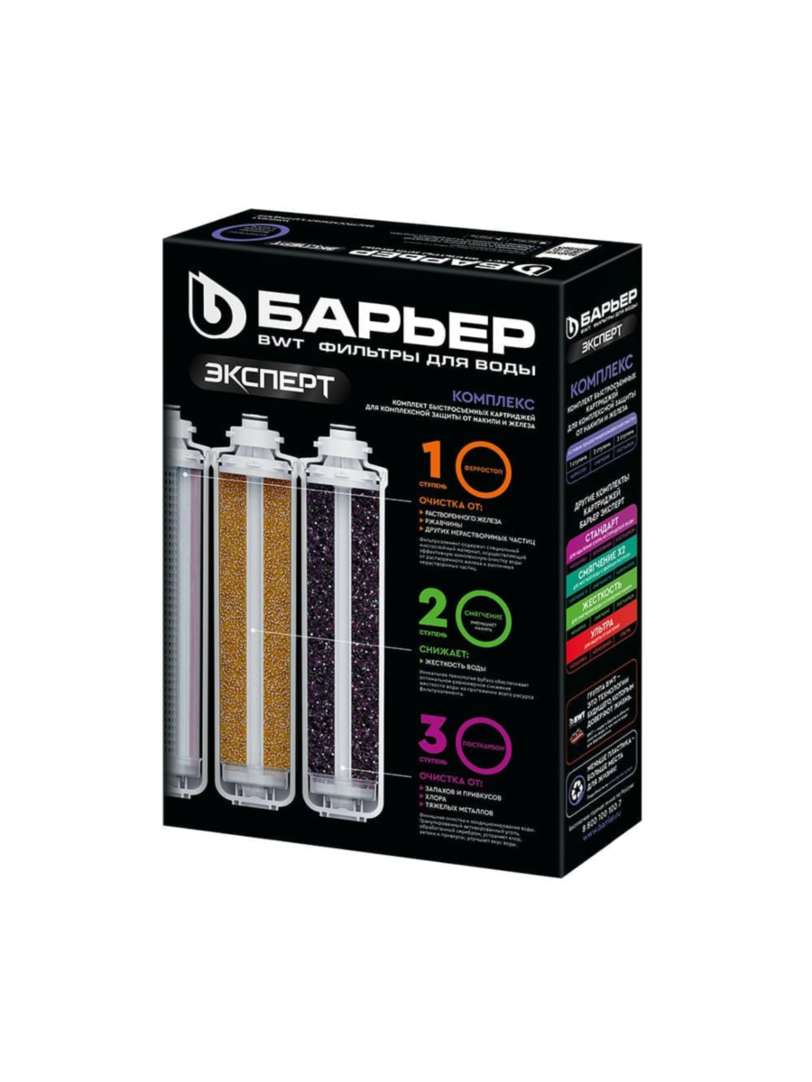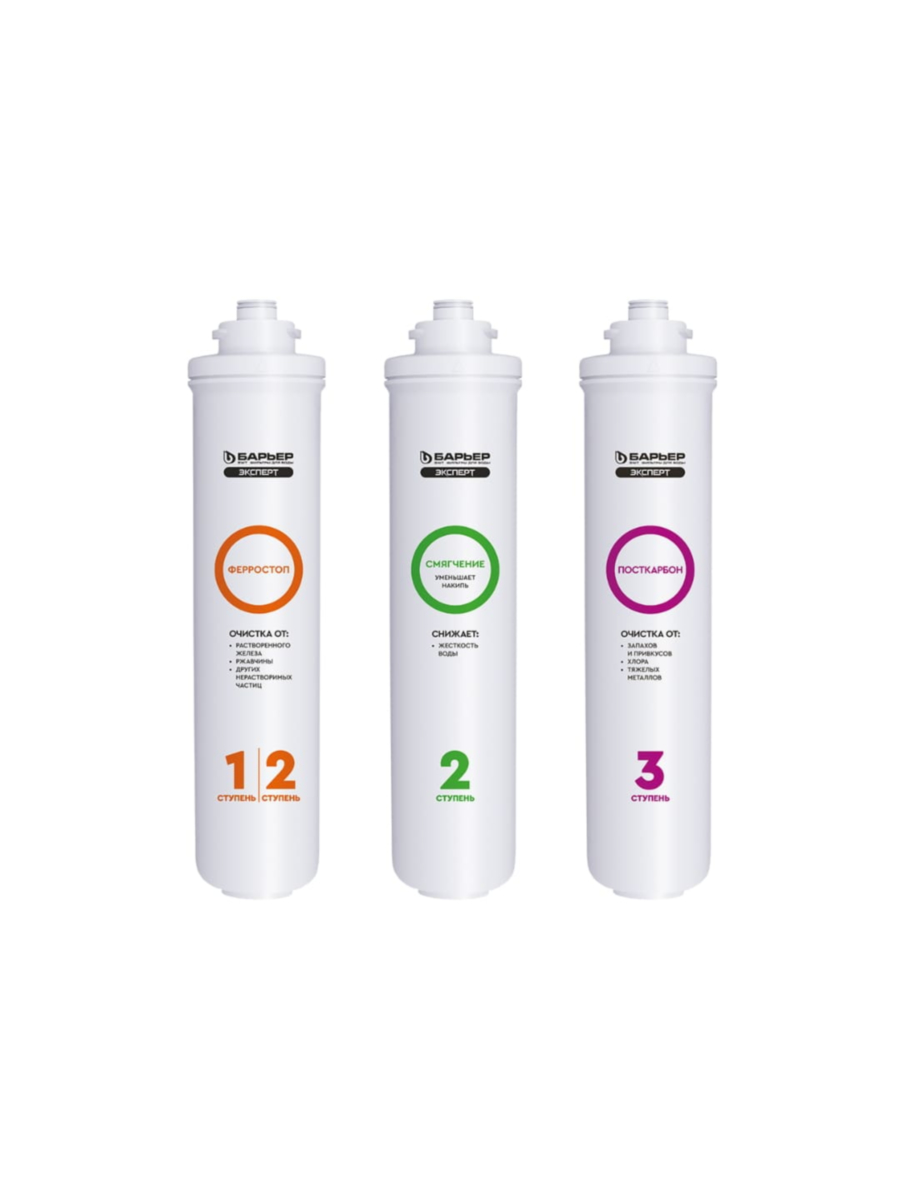 - Барьер Эксперт Ферростоп — эффективно удаляет растворенное железо и нормализует кислотность воды, предотвращая появление пятен и желтизны на посуде и сантехнике.