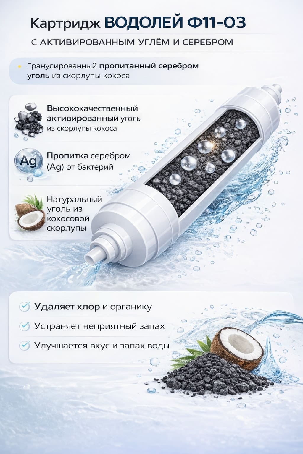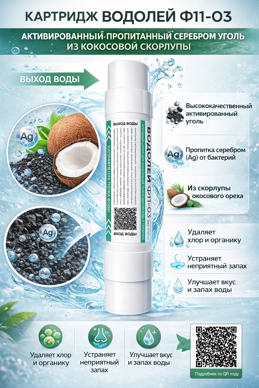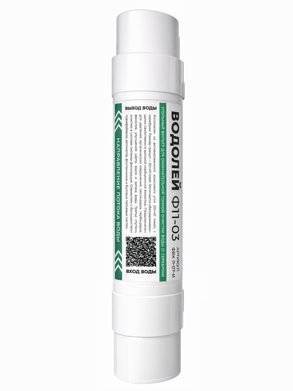 Водолей Ф11-03 это угольный фильтр для окончательной тонкой очистки воды. Для изготовления фильтра используется чистый, природный гранулированный материал, высококачественный активированный уголь, приготовленный из скорлупы кокосового ореха путем карбонизации с добавлением серебра, имеет размер гранул 20×40 mech. Данный наполнитель фильтра имеет ряд преимуществ перед другими фильтрующими материалами: высокая производительность и высокий коэффициент удержание адсорбированных мелких частиц; лучшая микропористая структура материала как внутри, так и снаружи каждой гранулы; огромная площадь фильтровальной поверхности; предотвращение развития в воде бактерий.