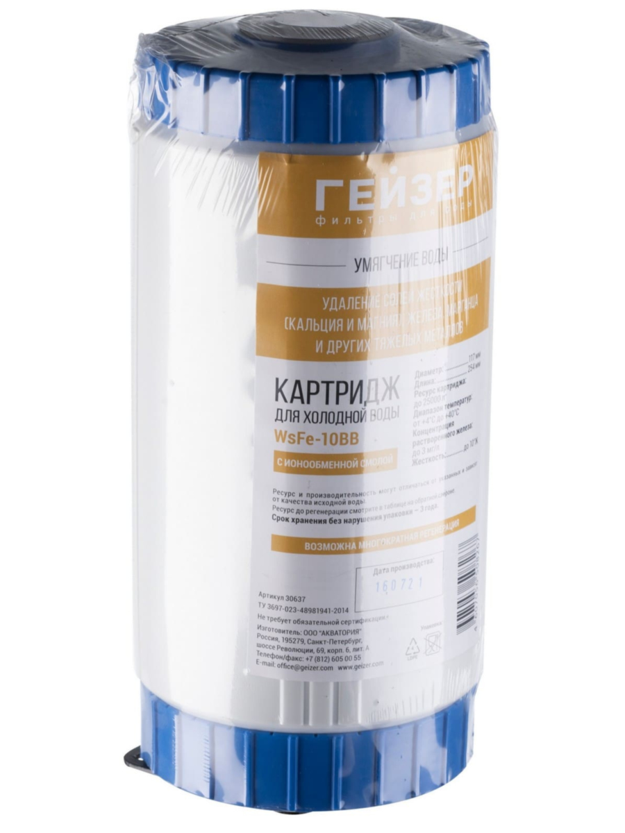 Регенеративный картридж Гейзер WsFe 10BB для смягчения и очистки жесткой воды с повышенным содержанием железа