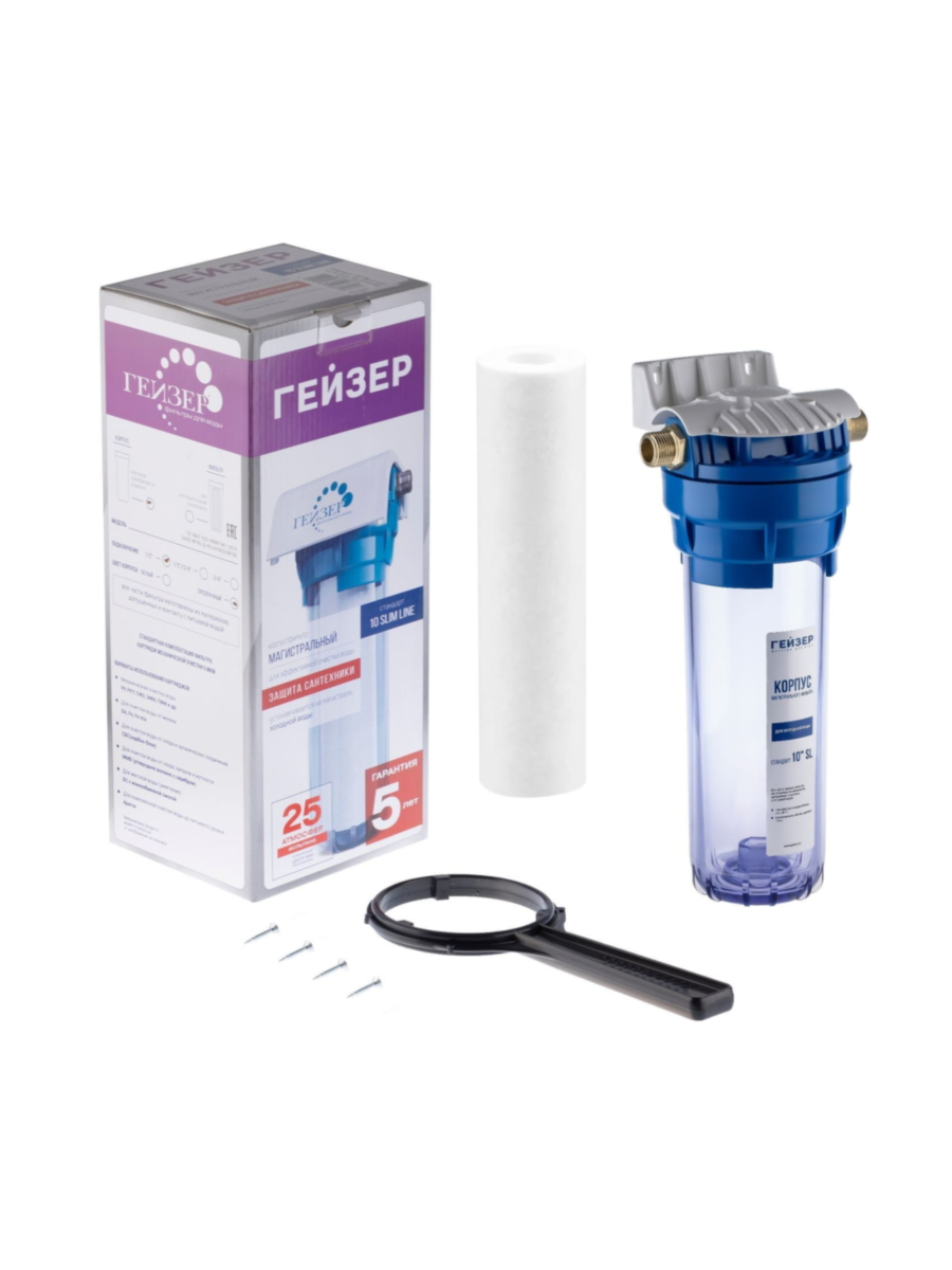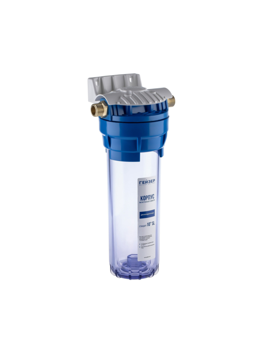 Магистральный фильтр Гейзер 1П 1/2-3/4 с прозрачной колбой предназначен для качественной очистки холодной воды в системах центрального водоснабжения.