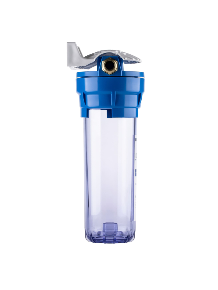 - Прозрачная колба позволяет наглядно контролировать степень загрязнения фильтрующего элемента, упрощая определение момента замены картриджа.
