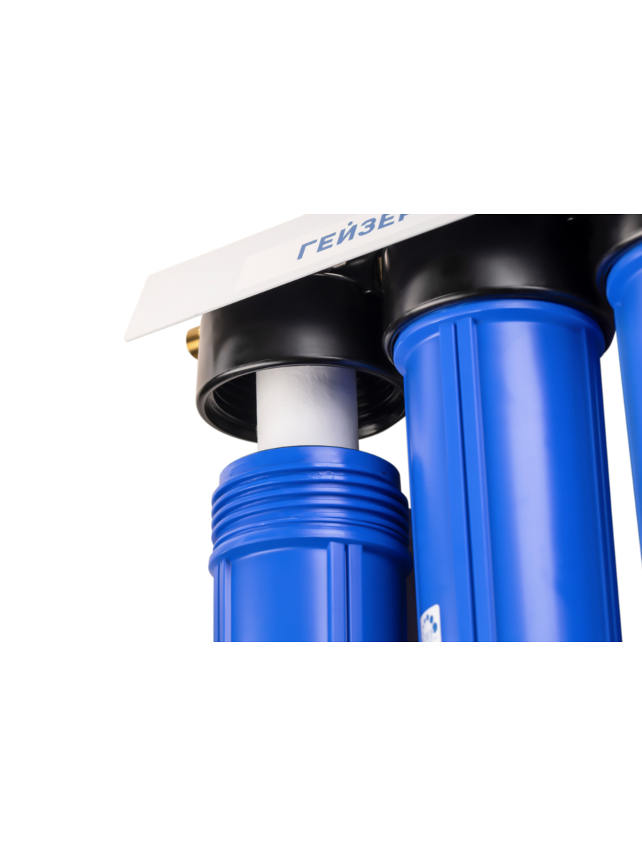 - Первая ступень — механический картридж Гейзер 28011, эффективно удаляющий нерастворимые примеси из воды.