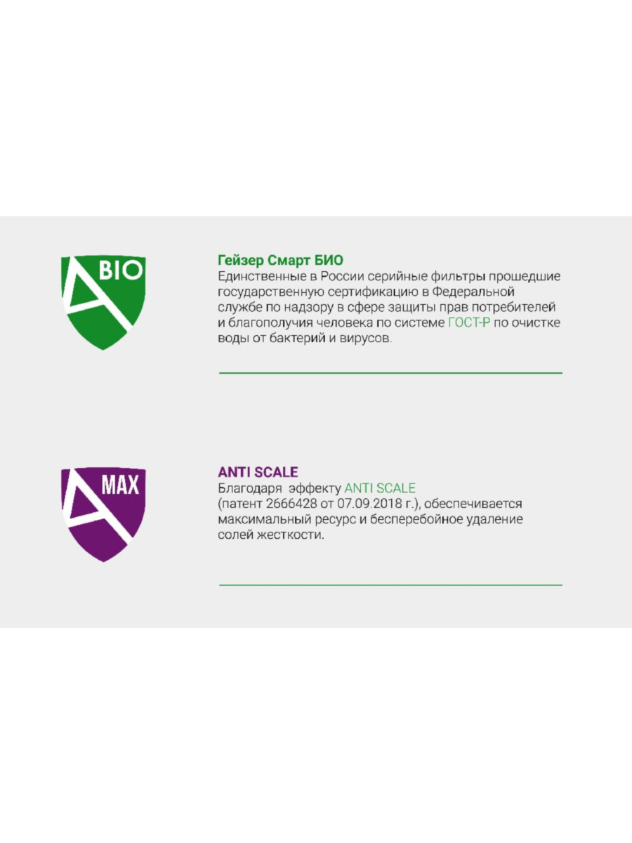 - Комплексно очищает воду, устраняя патогенные микроорганизмы, растворённые примеси, хлор, железо, тяжелые металлы, соли жесткости, фенолы и пестициды.