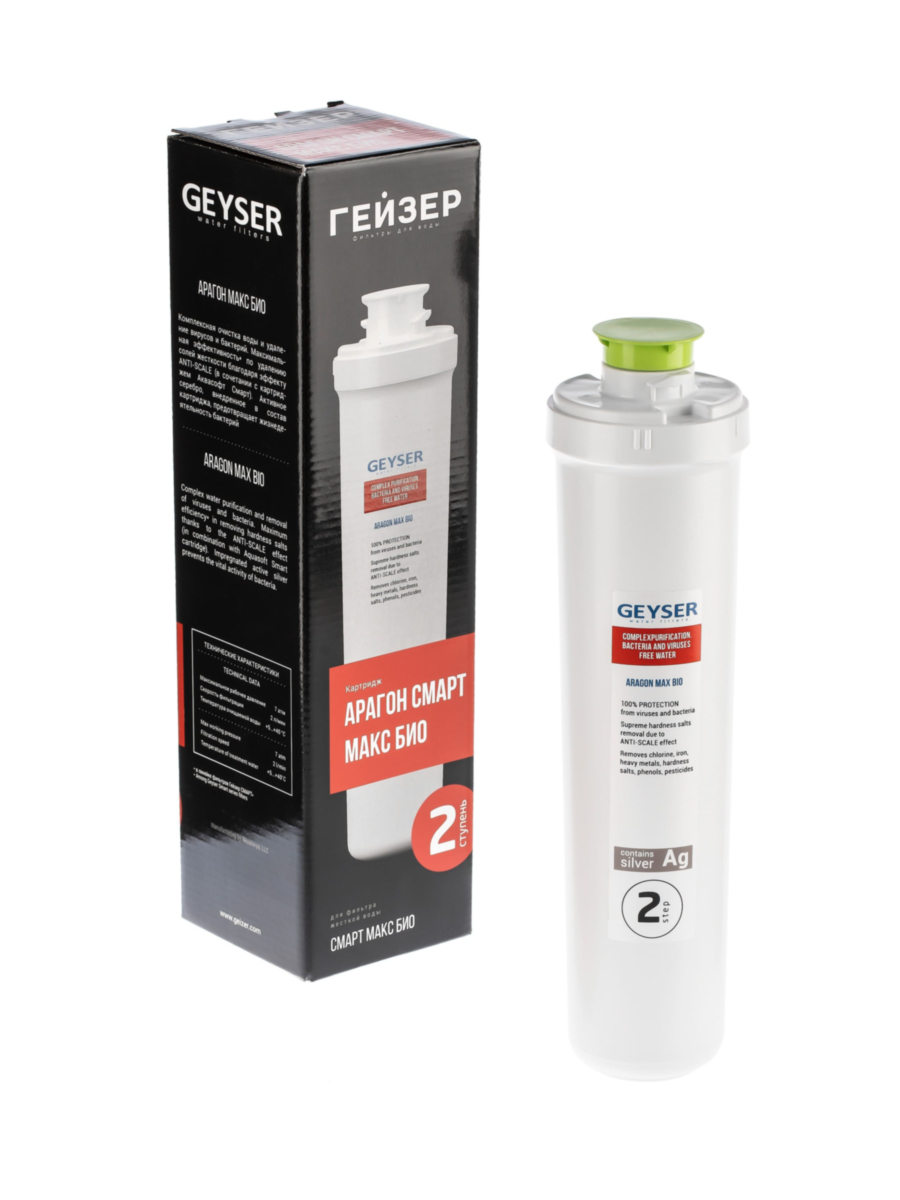 Картридж Гейзер Арагон Смарт Макс Био предназначен для глубокой обработки жесткой воды, обеспечивая её защиту от широкого спектра загрязнений и накипи. Применяется в качестве второй ступени фильтрации в моделях питьевых фильтров линейки Смарт Макс Био.