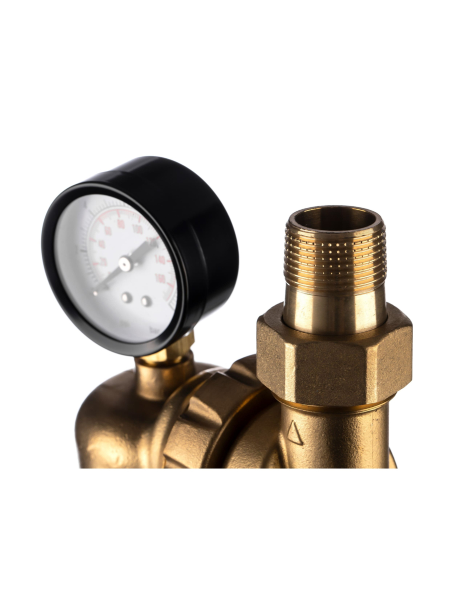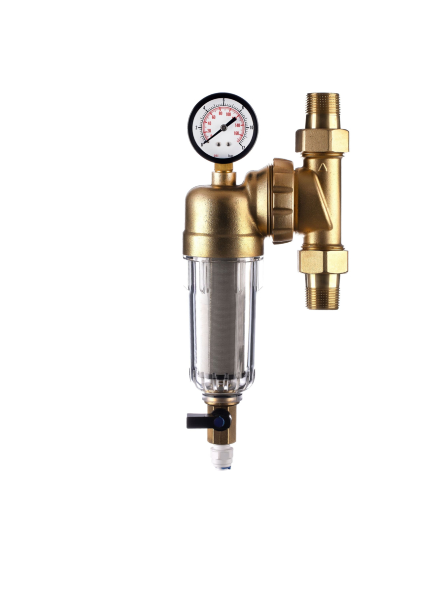 - Комплектуется радиальным манометром и фитингами с наружной резьбой 3/4 дюйма, что упрощает монтаж и подключение фильтра к водопроводу.