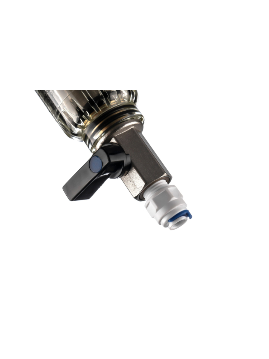 - В комплект поставки входят ключ для замены колбы и соединительные фитинги с наружной резьбой 1/2 дюйма, что обеспечивает лёгкость монтажа и подключения фильтра к водопроводу.