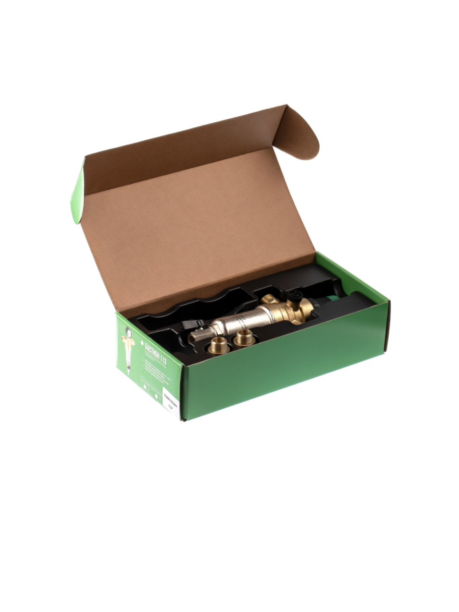 - Латунная колба фильтра позволяет обрабатывать горячую воду, нагретую до температуры +80°C, что делает его подходящим для систем горячего водоснабжения.