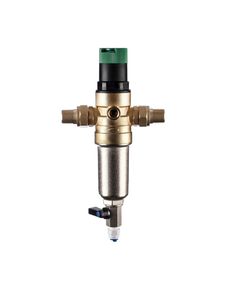 - Оснащен редуктором, регулирующим давление воды на выходе в диапазоне от 2 до 6 атм, что предотвращает гидроудары и нагрузку на бытовую технику и сантехнику.