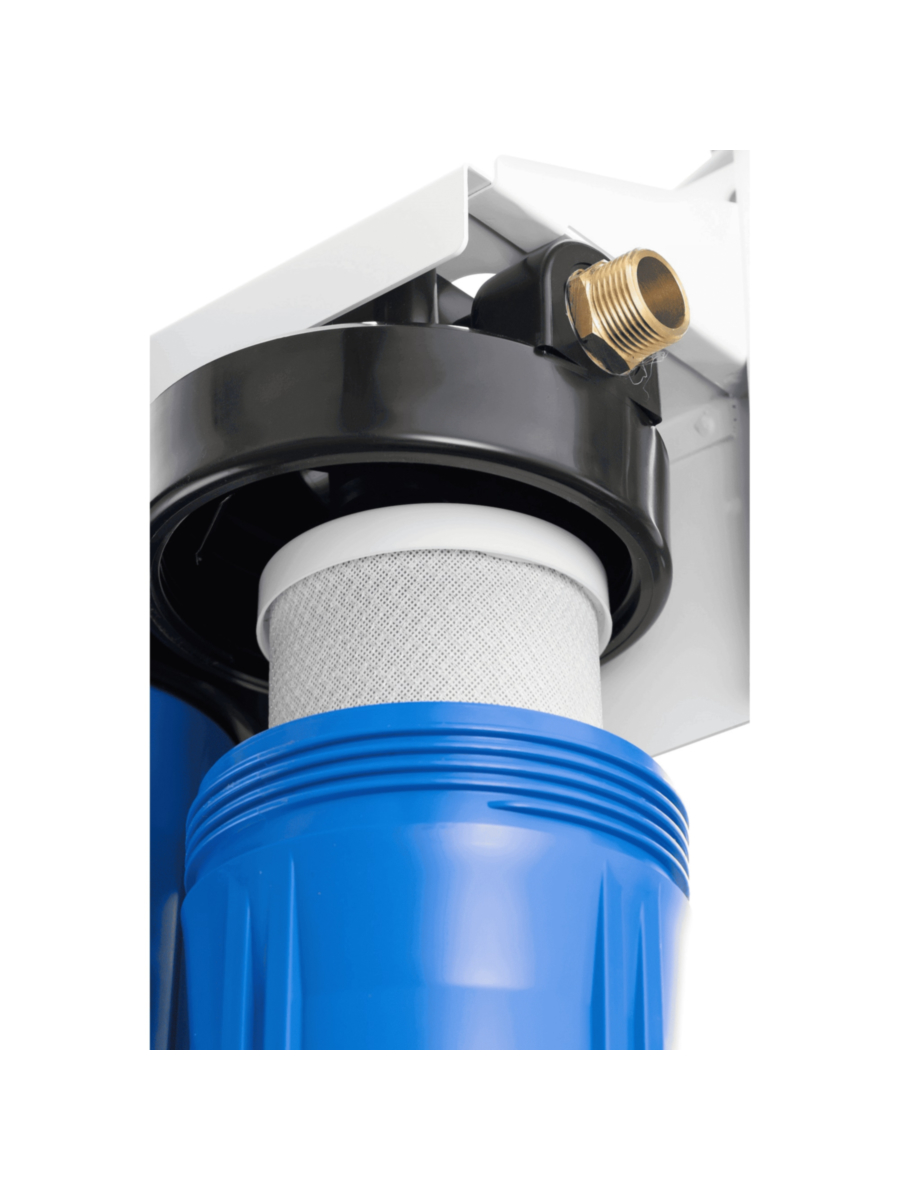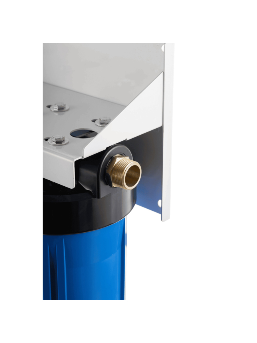 - Фильтр состоит из трех пластиковых колб формата Big Blue 10, закрепленных на металлическом кронштейне, что обеспечивает компактность и удобство монтажа.