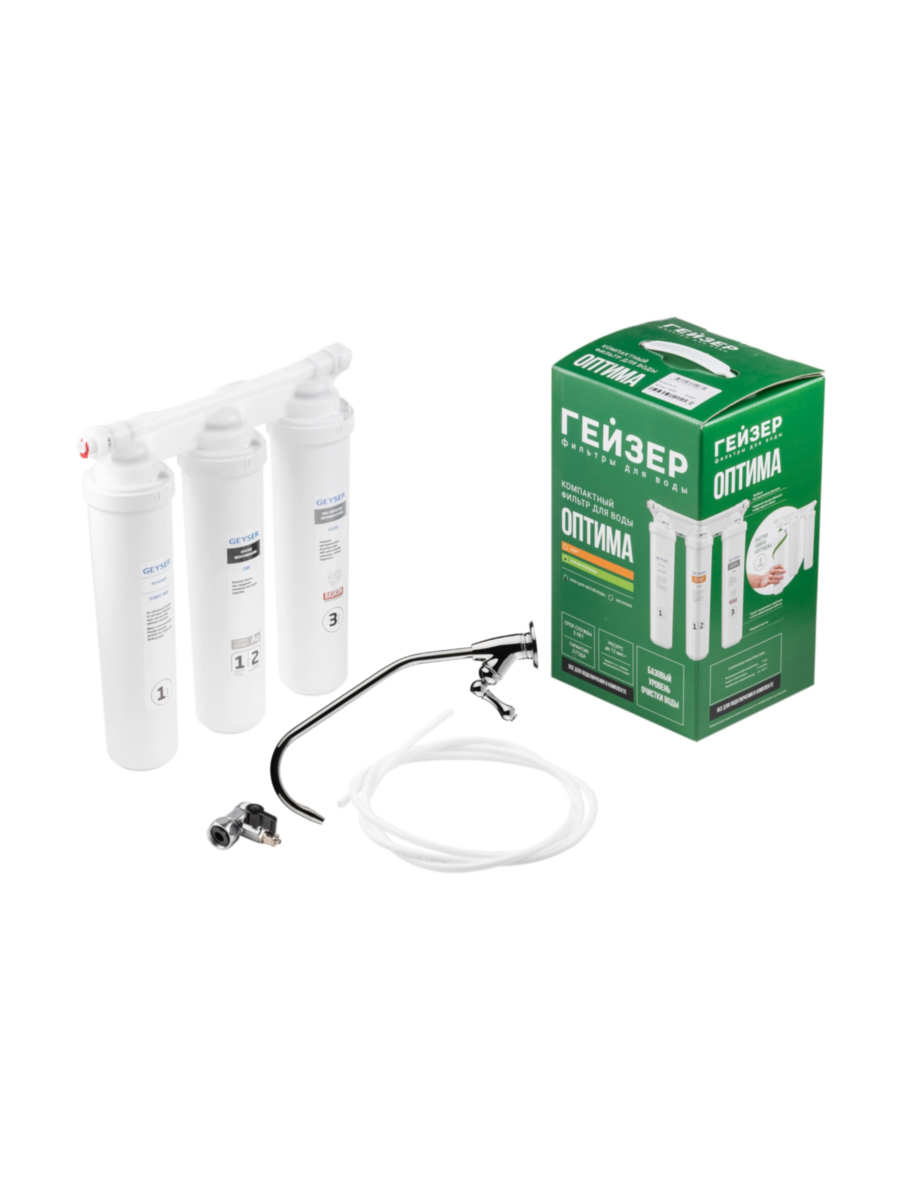 Гейзер Оптима М — это компактная и эффективная система фильтрации, предназначенная для глубокой очистки питьевой воды в домашних условиях. Отличается высоким качеством фильтрации, стильным дизайном и простотой в эксплуатации, что делает его идеальным выбором для обеспечения чистой и безопасной водой вашей семьи.