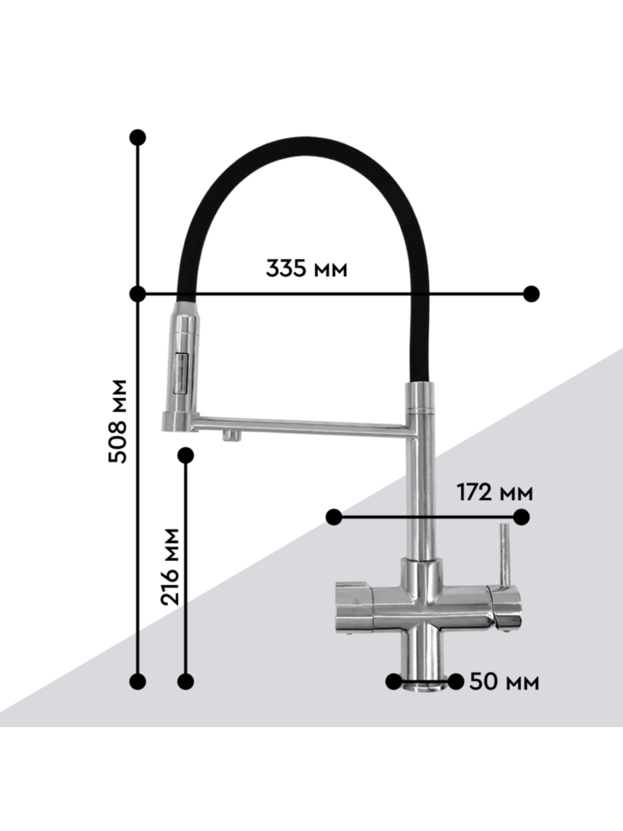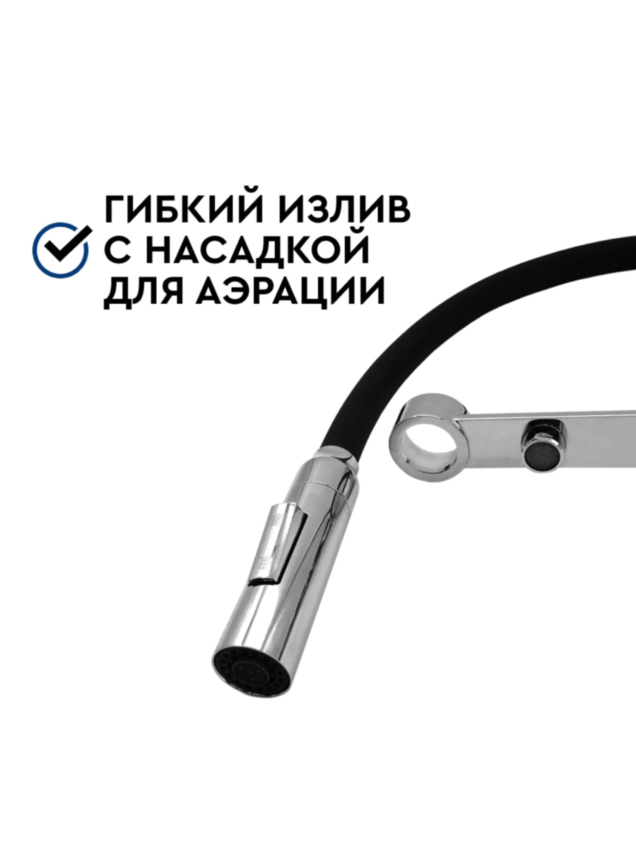 Смеситель оснащен отдельным краном для подачи питьевой воды, очищенной фильтром, установленным под мойкой. Это позволяет получать чистую и безопасную воду прямо на кухне, не прибегая к покупке бутилированной воды. Корпус смесителя выполнен в современном дизайне, а черный излив добавляет особого стиля и контраста.