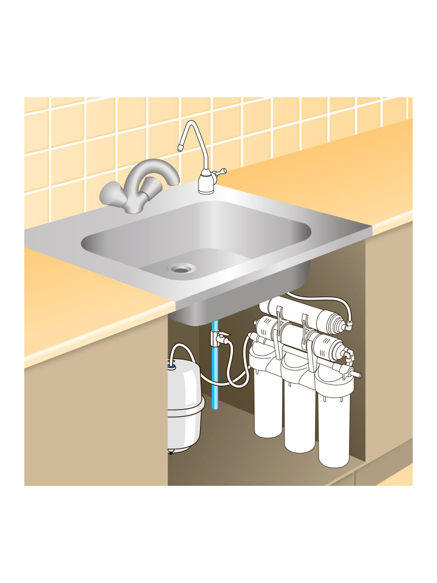 Стандартный фильтр обратного осмоса, состоящий из пяти ступеней очистки, оснащенный мембраной типоразмера 1812, размещенным в отдельном блоке.