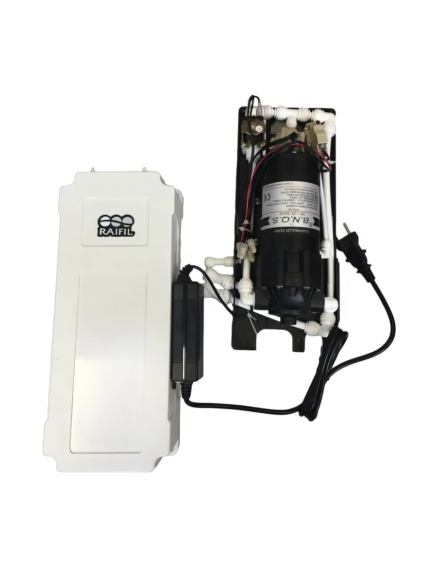 - В комплект входят насос Raifil RO-900-220, присоединительные фитинги и трубки, реле низкого и высокого давления, блок питания 220В, обеспечивая полный набор для установки и подключения.