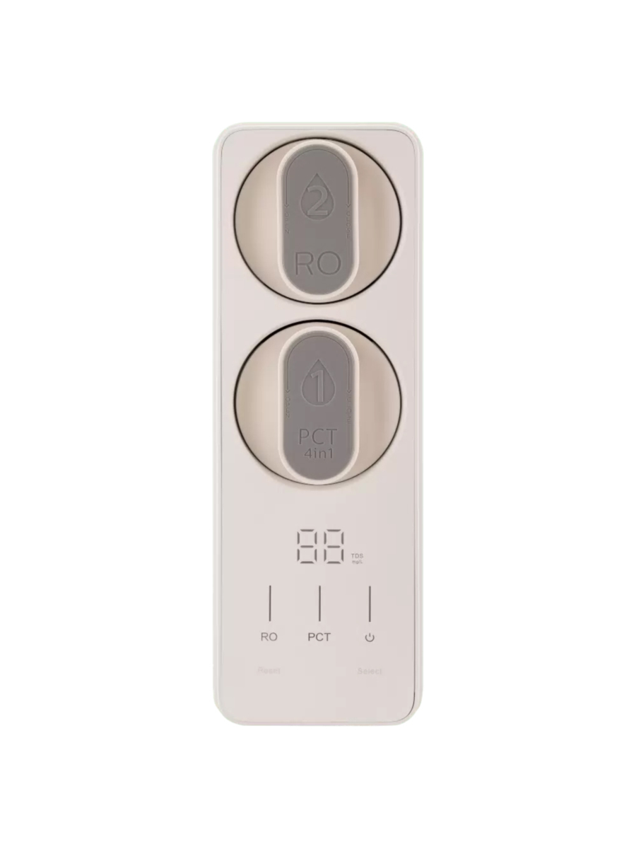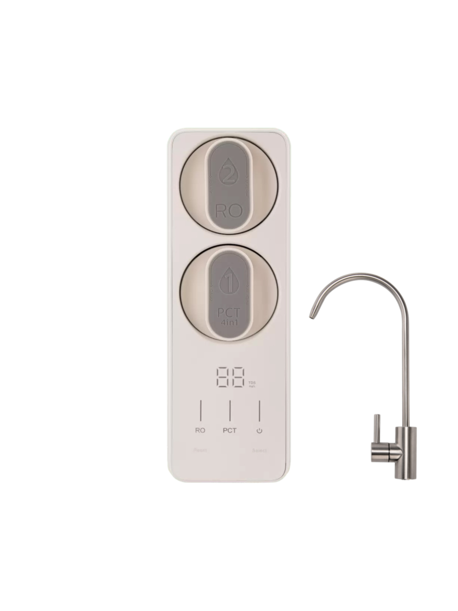 - Интегрированный сенсор TDS непрерывно замеряет уровень растворённых веществ и выводит показания качества воды на экран.
