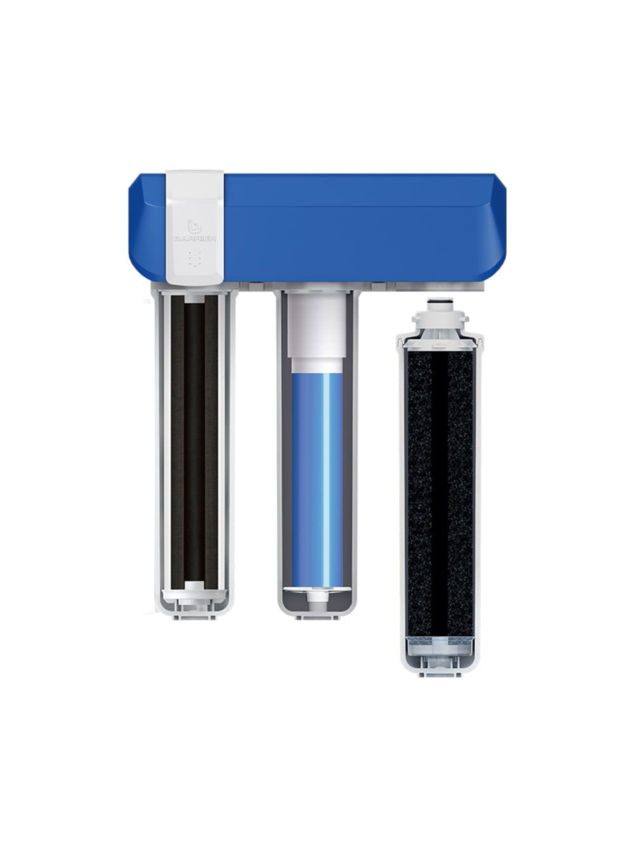 - Три быстросъемных картриджа обеспечивают выполнение четырех последовательных этапов очистки воды, гарантируя получение качественной питьевой воды.