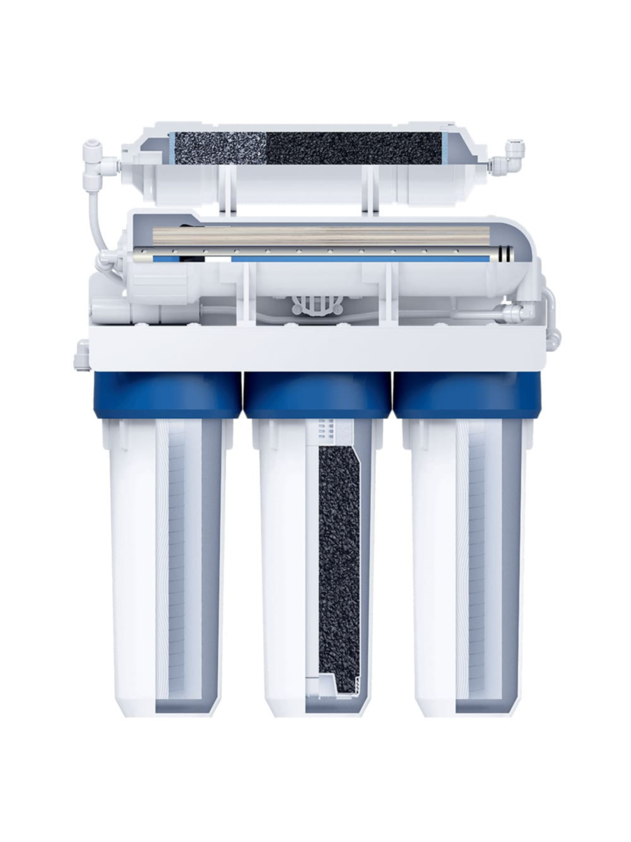 - Основательная обратноосмотическая мембрана 100 GPD, обеспечивающая экстраординарную очистку от микроскопических частиц вплоть до 0,0001 мкм.