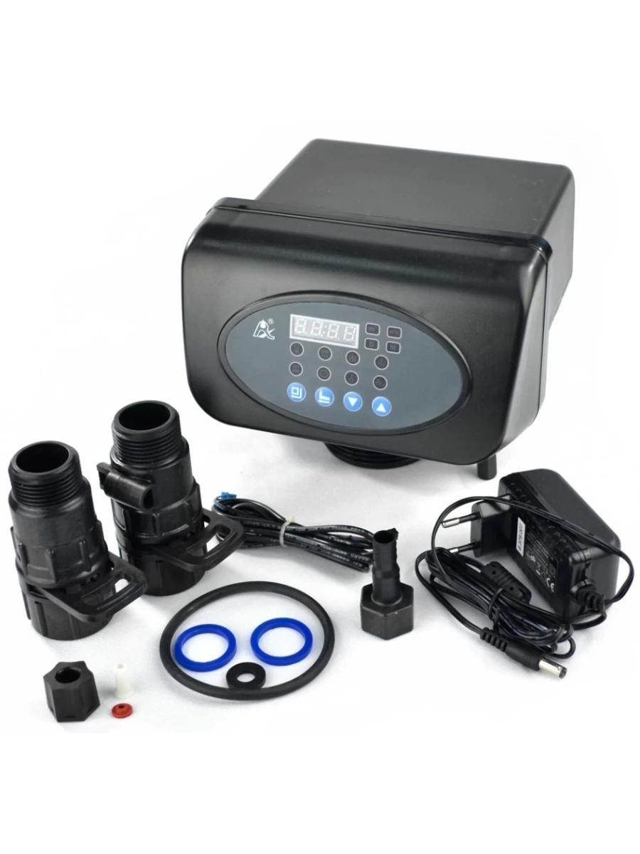 Изготовленный из высококачественного материала Noryl, клапан состоит из блока распределения потока воды и блока управления. Блок управления включает в себя электронную плату и кнопки с LED монитором, что позволяет легко настроить и контролировать работу устройства. Для полноценного функционирования клапан требует подключения к источнику воды, реагентному баку и дренажному сливу для отведения отходящих вод.