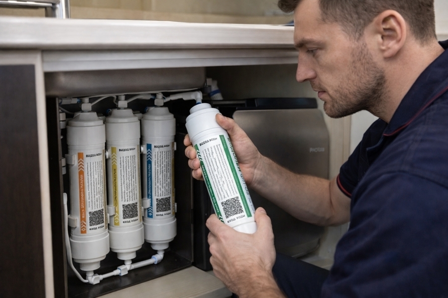Рекомендация: замена комплекта картриджей 1 раз в 6 месяцев или при прохождении 5000 литров. Степень очистки и ресурс фильтров зависят от качества исходной воды.