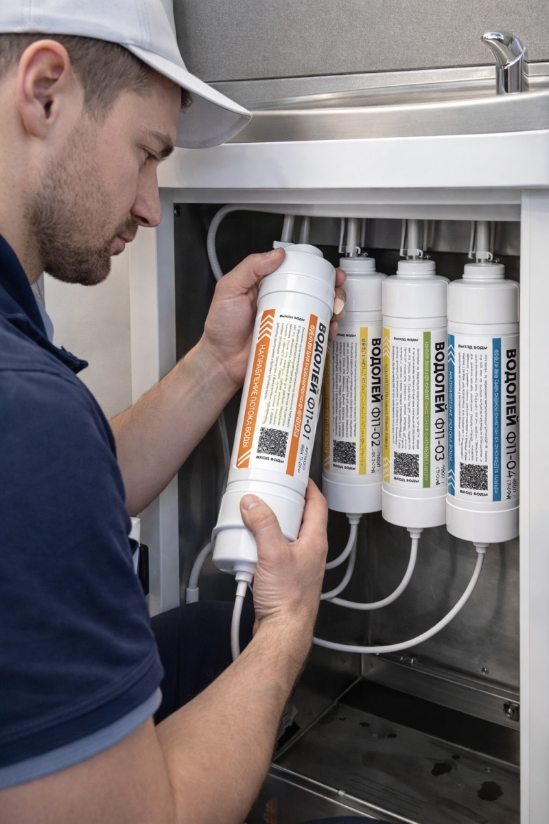 Комплект картриджей «Водолей №01» поставил сразу вместо разрозненных фильтров разных брендов — и это, пожалуй, самое удачное решение за последнее время. Нравится, что здесь всё продумано именно как одна связка из четырёх ступеней: от грубой механики до тонкой «полировки» и обеззараживания. Не нужно подбирать картриджи по одному, думать, что к чему подходит — просто меняешь весь комплект, и система снова работает как новая.;По работе ступеней видно, что они действительно дополняют друг друга. Первый картридж (Ф11‑01) забирает на себя всю видимую грязь: песок, ржавчину, мутные взвеси. Стакан после пары месяцев эксплуатации выглядит «боевым», но именно за счёт этого следующие фильтры остаются гораздо чище. Второй модуль (Ф11‑02) уже дорабатывает по мелкой механике и подготавливает воду к уголю — после него исчезает остаточная мутность, вода становится визуально прозрачнее. Третий (Ф11‑03) отвечает за вкус и запах: убирает хлор и городскую «канализационную» нотку, вода перестаёт пахнуть водопроводом, чай и кофе становятся приятнее. И финальный картридж (Ф11‑04) даёт ощущение именно «финишной» очистки: вода выходит очень мягкой по органолептике, без посторонних привкусов, с хорошей прозрачностью, при этом система не превращается в громоздкий осмос с баком.отмечу удобство формата. Все модули — ; без корпуса, вставляются в стандартные колбы без каких‑то извращений. У меня фильтр был другого бренда, но тоже с 11‑дюймовыми колбами — комплект встал без проблем, по резьбе и посадке всё совпало. Замена занимает по факту не больше 20–30 минут даже без опыта: перекрыл воду, стравил давление, снял старые картриджи, промыл колбы, поставил новые ...